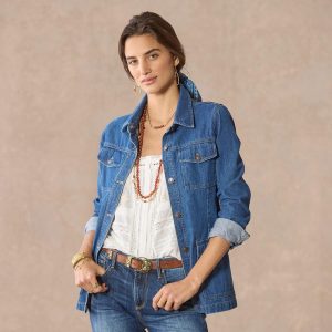 Classic denim detailing in a safari-inspired style gives our fun jacket a vintage vibe. Fitted. with four pockets. self tie and antiqued copper button front. Cotton. Machine wash. Imported. Exclusive. Sizes XS (0??). S (4??). M (8??0). L (12??4). XL (16??8). XXL (20??2). Approx. 27.5l.