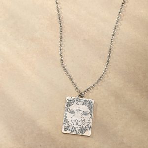 Jes emblazons her sterling silver pendant with a lion?Cemblem of a fearless spirit. etching a reminder to Trust your inner wisdom on the back. It’s strung on an oxidized sterling chain. finished with a lobster clasp. Handmade in USA. 18l