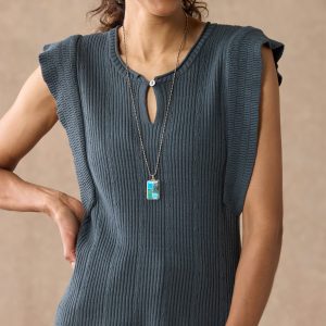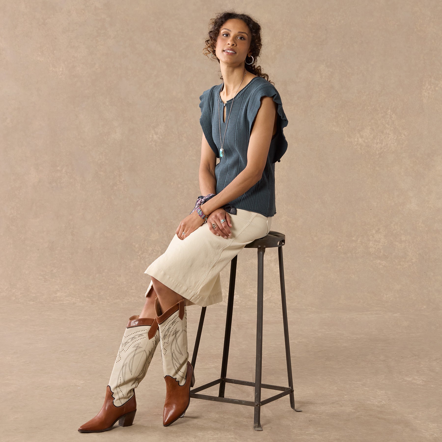 This ribbed cable sweater features a variety of textures. flutter sleeves and a front keyhole with button. Polyester/viscose. Hand wash. Imported. Sizes XS (0?C2). S (4?C6). M (8?C10). L (12?C14). XL (16?C18). Approx. 22l.