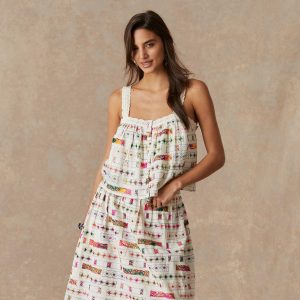 Lace straps and detail adorn this button-down tank with allover embroidery. Lined. Cotton. Hand wash. Imported. Sizes XS (0-2). S (4-6). M (8-10). L (12-14). Approx. 14l.