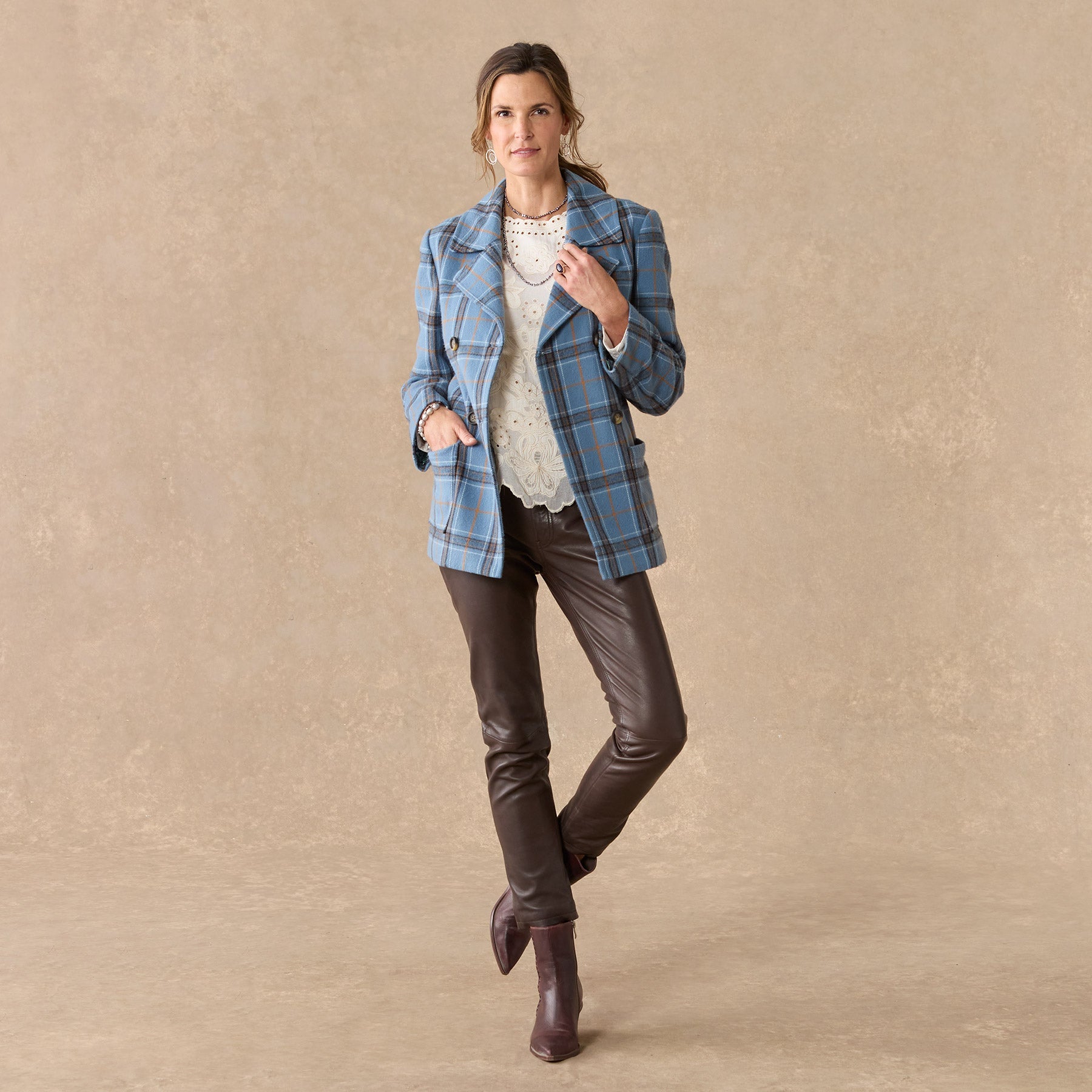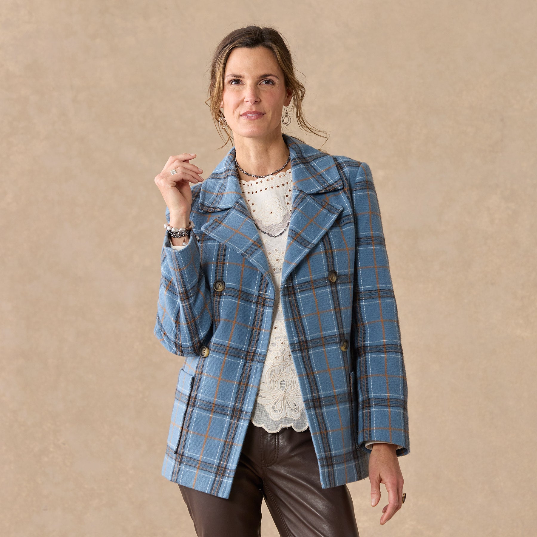 Our smart. brushed flannel plaid pea coat is soft. classic and beautiful. Double breasted. with faux horn buttons. patch pockets and a fun. floral-printed lining. Polyester. Dry clean. Imported. Exclusive. Sizes XXS (00). XS (0–2). S (4–6). M (8–10). L (12–14). XL (16–18). Approx. 27l.
