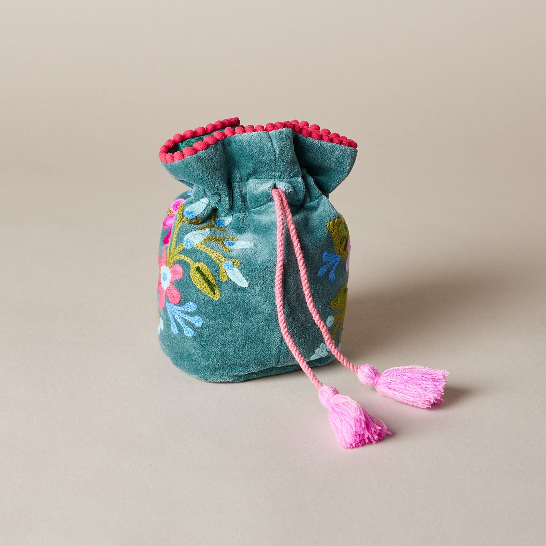 Lavishly embroidered. our personalized velvet pouches brighten every day as they keep jewelry protected and organized. Handmade from cotton. with tasseled drawstrings. mini pompom trim and inner slip pockets for rings. studs and other small treasures. Handmade. Exclusive. 6w x 7h.